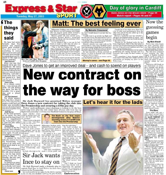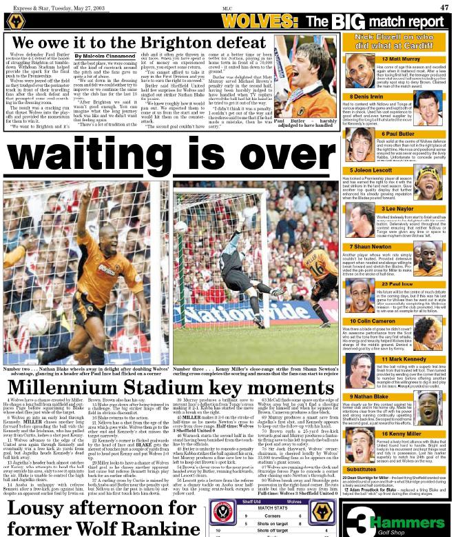 Wolves suffered badly in 2002 when a 12 point lead in March evaporated, the Baggies were promoted, and the third place led to a play-off defeat. One year on and we struggled a bit more but finished the season on form beating Reading in the semi finals, thanks to a brilliant strike by Alex Rae.