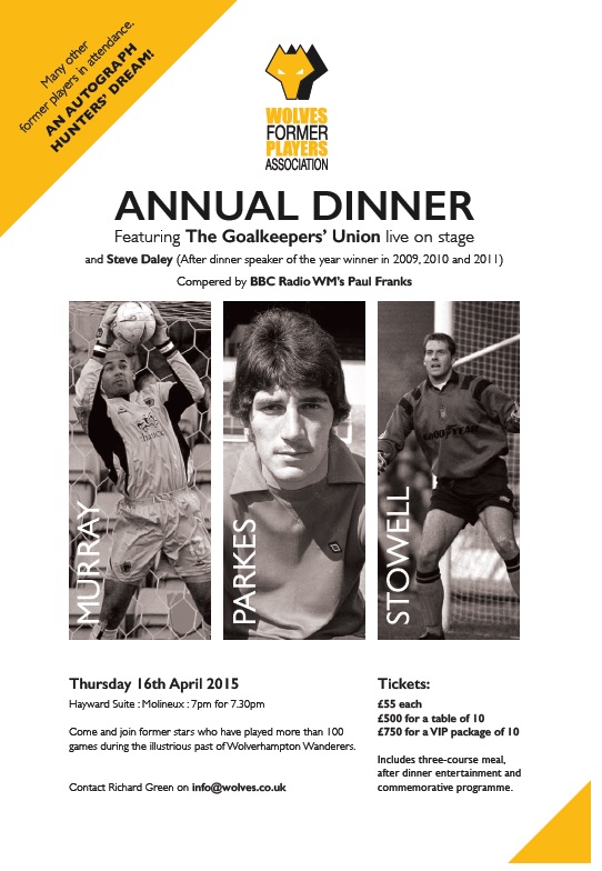 Wolves Former Players' Association Dinner at Molineux 7 for 7:30 with Steve Daley and The Goalkeepers' Union £50-£55 per head |