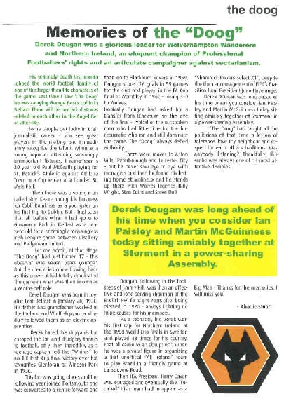 The Times and Wolves Supporters don’t always end up in the same room, particularly since Snellings started using plain paper to wrap their chips, but with me being from the posh end of Town, I noticed some time ago that The Times can be relied upon to serve up a top obituary . For all of us mourning the passing of the Wolves Legend “The Doog” yesterday, I am pleased to say The Times have come good and the Doog deservedly gets 2 pages, so for anyone who did not buy it today, I attach the 2 pages, along with my own little tribute to the great man. Mike thanks for letting me know about this sad event so quickly.
