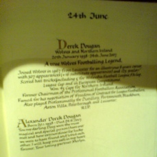 “ I was very privileged, in that, having idolised “the Doog” from the terraces as a Wolves fan, in later life I got to know him well, and became great friends with him. Prior to this, my nearest off the pitch contact with the Doog, was when the local paper published my O Level results by mistake in the name of Derek Dougan, I was as chuffed as my Mother was angry. In recognition of this incident, we communicated after I got to know the Doog off the field, as DD1 and DD2, needless to say he was, and always will be DD Number 1. I loved every minute of my one to one dealings with him and I am pleased we spoke very recently. He held out great hopes for Wolves in the new season and liked the look of the new owner and thought Mick McCarthy was doing a great job.