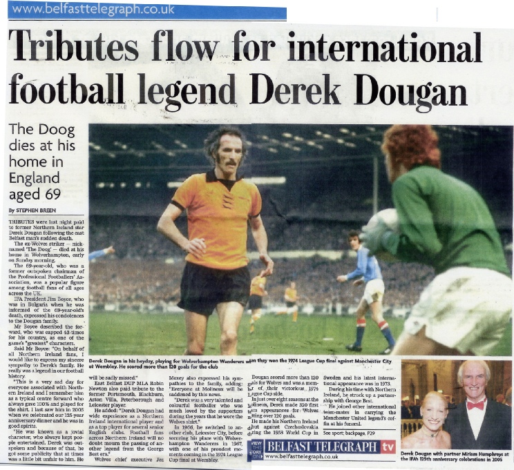 24th June 2007: It is with great sadness that we learned from Merlyn that London Wolves President and Former Northern Ireland and Wolves centre forward Derek Dougan has died, aged 69.