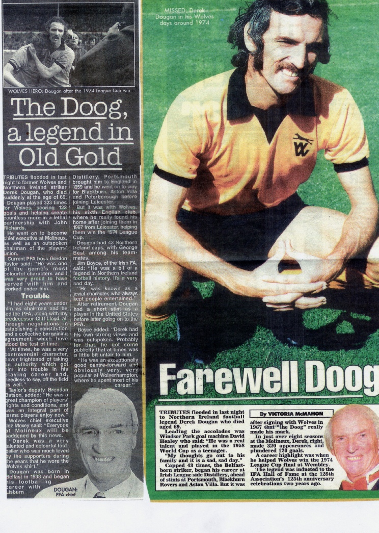 Don’t be sad just think and smile of the doog! Great man, always loved the fans, I was totally hooked on Wolves from that magic March 1967 debut and still follow the wolves home and away. All supporters of that era witnessed some magic moments that will stay with you for the rest of their lives. Hey Doog, DDD Dougan, Doog Doog Doog the Doog, his name is Derek Dougan and from Leicester he did come, WHAT’S HIS NAME – DOUGAN, WHAT’S HIS NAME DOUGAN.