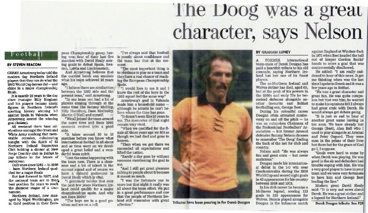 Dougan made his Northern Ireland debut against Czechoslovakia during the 1958 World Cup in Sweden and his latest international appearance was in 1973.