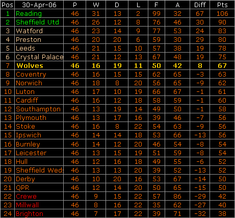 So the season finished in 7th. Immediately released were Postma, Ross, Anderton and fan’s favourite Vio Ganea who were all out of contract but Wolves belatedly offered Cameron a deal - presumably one he wouldn’t accept. Jeremie Aliadiere returned to Arsenal. Ince seemed to have been offered a much reduced deal, Kennedy’s position was unclear with Premiership teams chasing him and we expect the certain departure of our main defender Joleon Lescott. Kenny Miller - the fans player of the season - had already signed a pre-contract with Celtic and signed on 1st June. Be prepared for youth and rebuilding in 2006-7 as 6,000 season ticket holders don’t renew... losing 9,000 since the Premiership.