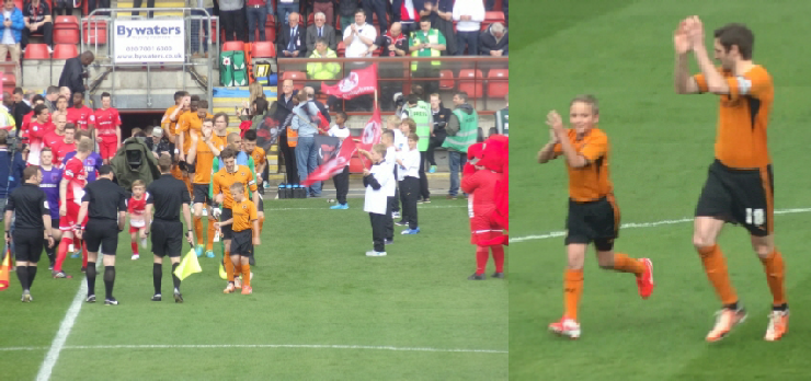 3-1 win against Leyton Orient in League Division 1 on Easter Monday 21st April 2014 at Brisbane Rd, although they had to wait two hours for former wolf Stephen Gleeson to convert a penalty won by sometime Wolves target Izale McLeod whi also scored the equaliser for MK Dons to hold Brentford, Orient congratulated the Wolves. Tommy had been selected by Wolves’ shirt sponsors What House - thanks to Rupert Bates. The Orient looked after Tommy very well, and his granddad Fireman John2 and Kenny Jackett very kindly allowed them into the dressing room. Captain Sam Ricketts made sure everyone signed Tommy’s away shirt and then led him to applaud the fans, and then had a short kickabout with the match ball. The youngest Orient mascot apparently possesses a Wolves fan for a father too.