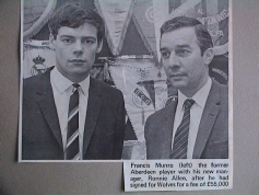 Frank Munro 1947-2011 Frank had been a regular participant in London Wolves events, unwittingly helping a member into the Millennium Stadium for the play off final! A tough tackling defender in his day, he has fought ill health since a storke in 1993. Frank joined Wolves in our first season back in the top flight in 1968 from Aberdeen after scoring against us in a pre-season tour and went on to play 376 times for the Wolves scoring 19 goals, before moving to Celtic in 1977 after a brief loan spell. Frank was a stalwart of the side which won promotion back to the first division in 1977 and won 9 Scottish International caps while at Molineux. Frank is pictured with Wolves manager Ronnie Allen. |