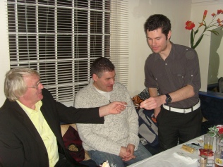 Roy surprised us all with a most entertaining and mystifying magician, Ed Sumner, who managed to fool everybody and had Phil O’C tied up in rubber bands, while training an apprentice. Ed’s bemusing tricks are in the second picture gallery here and in this picture is bamboozling Waggy (with Mark Feehan)