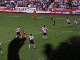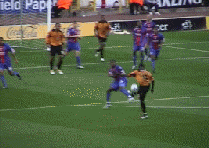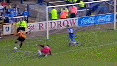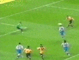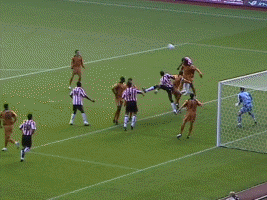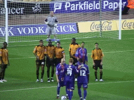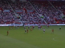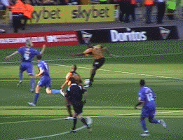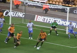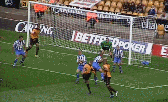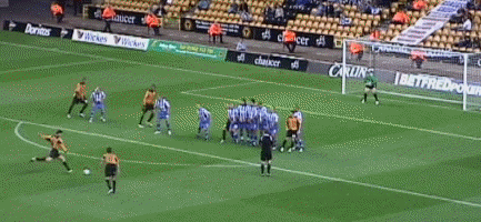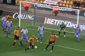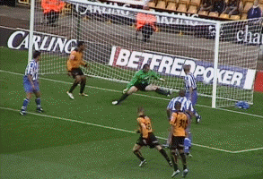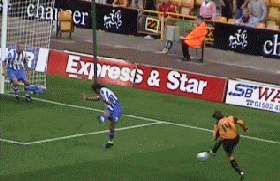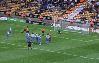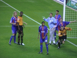 At last the moment Molineux had waited two years for. George Ndah comes back on, replacing the hard working Kenny Miller. His speed certainly worried the Palace defenders, and his presence contributed to the goal in the 84th minute. But before that Johnson won a free kick. Palace worked a very good move, which cut the wall out by the continued movement of McAnuff. Jackie was alive to this but you can see how much of a gap opened ip to the sied of the wall, which had also drifted right.