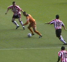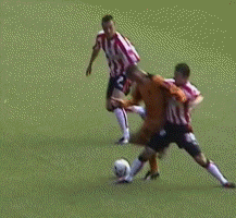 The match was predicted to be hard but the referee’s card count of 8 yellow and one red showed how he lost control early and never regained it. He wasn’t helped by fairly inept linesmanship. However he had let a couple of early ones go and that’s when he lost control. Here Kenny is clattered by David Prutton (who was banned for 10 matches last season for an assault on a referee)