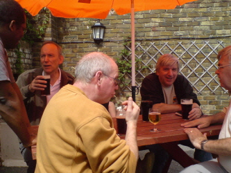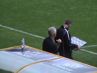 Even the weather, so poor for the previous week, held up in honour of the occasion, turning into the sort of balmy July evening that summer soccer should be about. The home side held up well for sixty minutes, even with a slew of half-time substitutions, and had several good chances - including a seven-metre almost open goal that invited Tarzan to score in his own match. Instead he did something he rarely did in his playing prime: he skied over! He did score, however, when he led the Blue team against the Whites in a half-time veterans' mini-match.